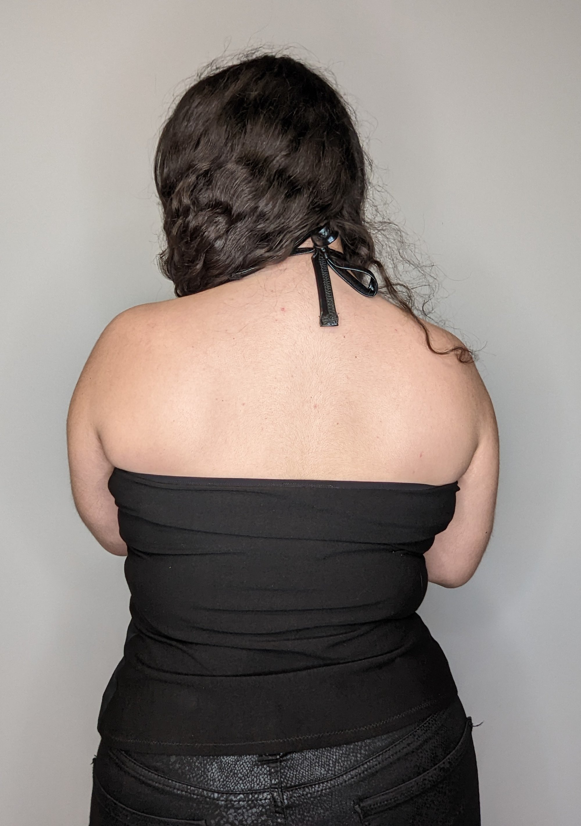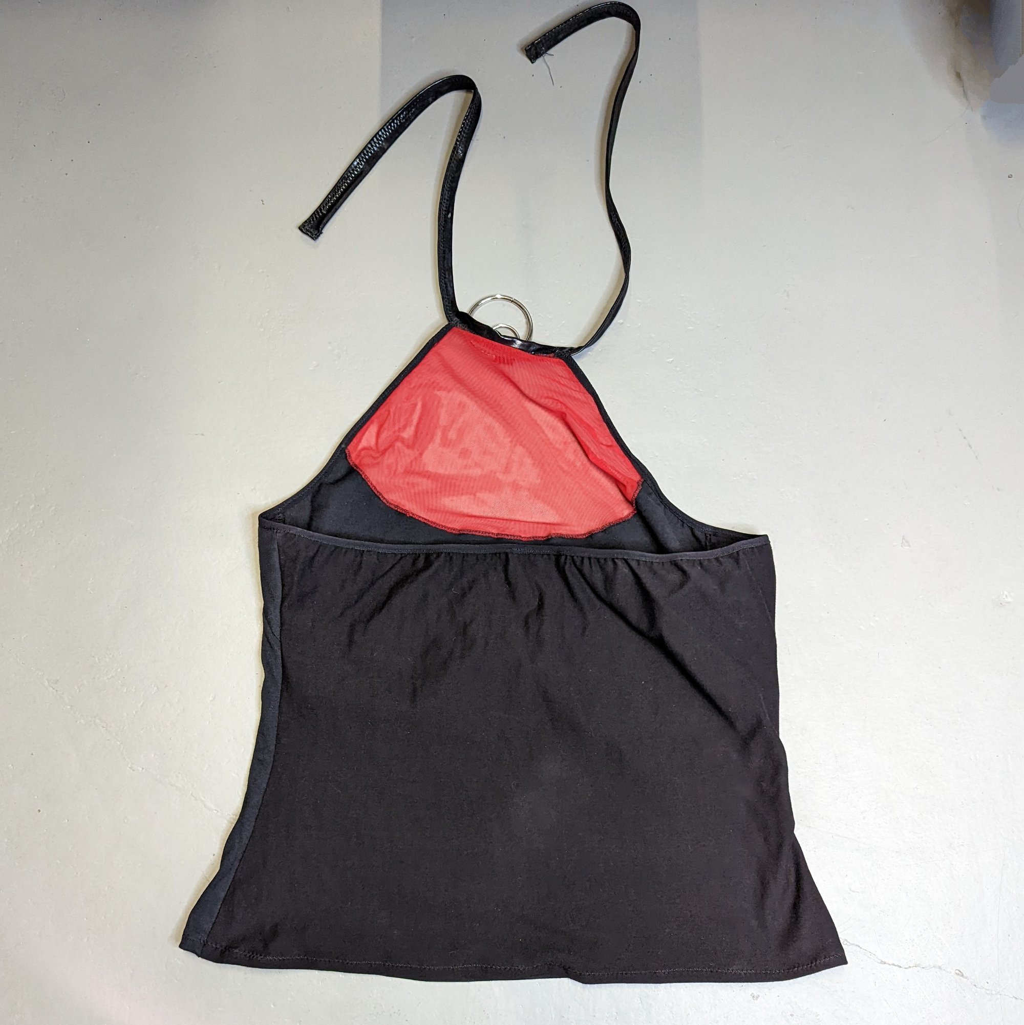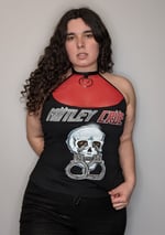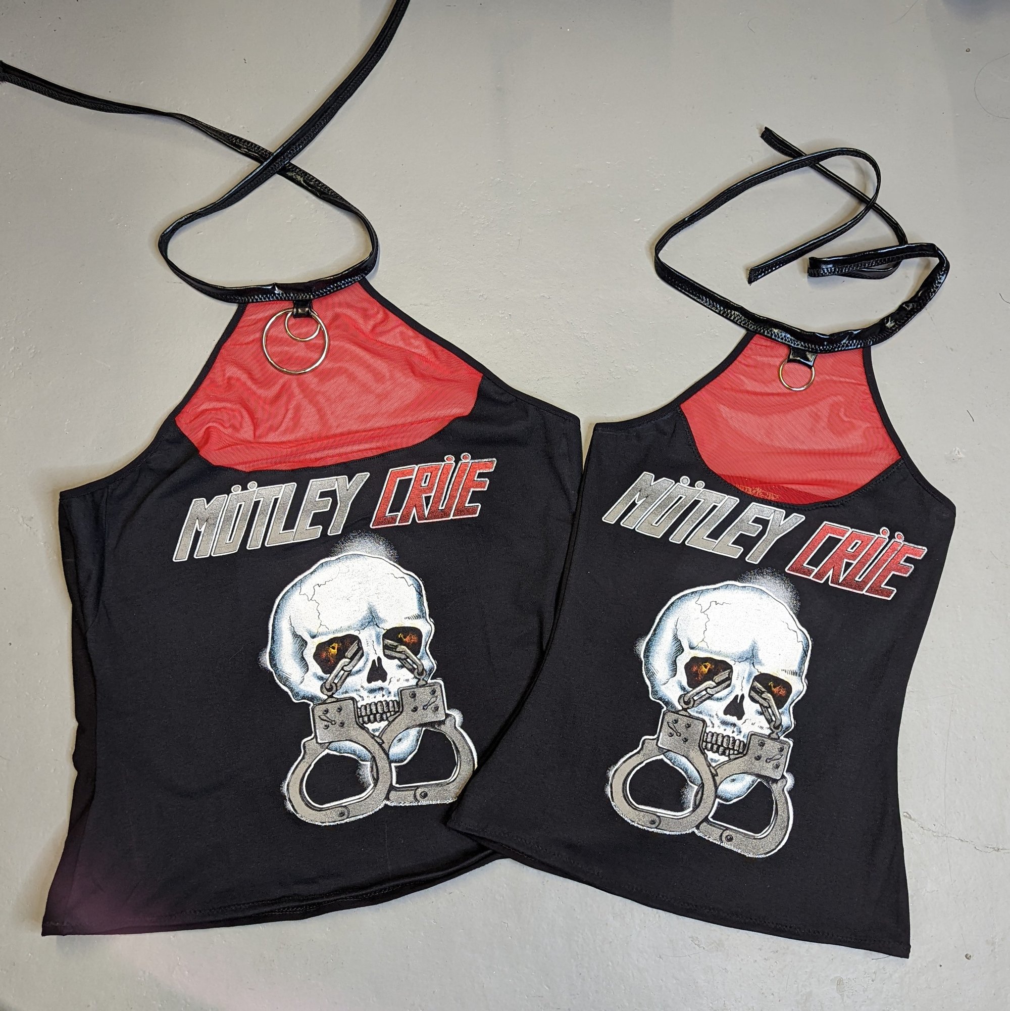 This top is made from an official Motley Crue shirt. It was reconstructed into a fitted tank top that is backed with stretch fabric for the perfect fit. The high neckline is made with red mesh fabric and the neckband is made from faux leather. It has 2 o rings (one on the xs) that hang from the center.